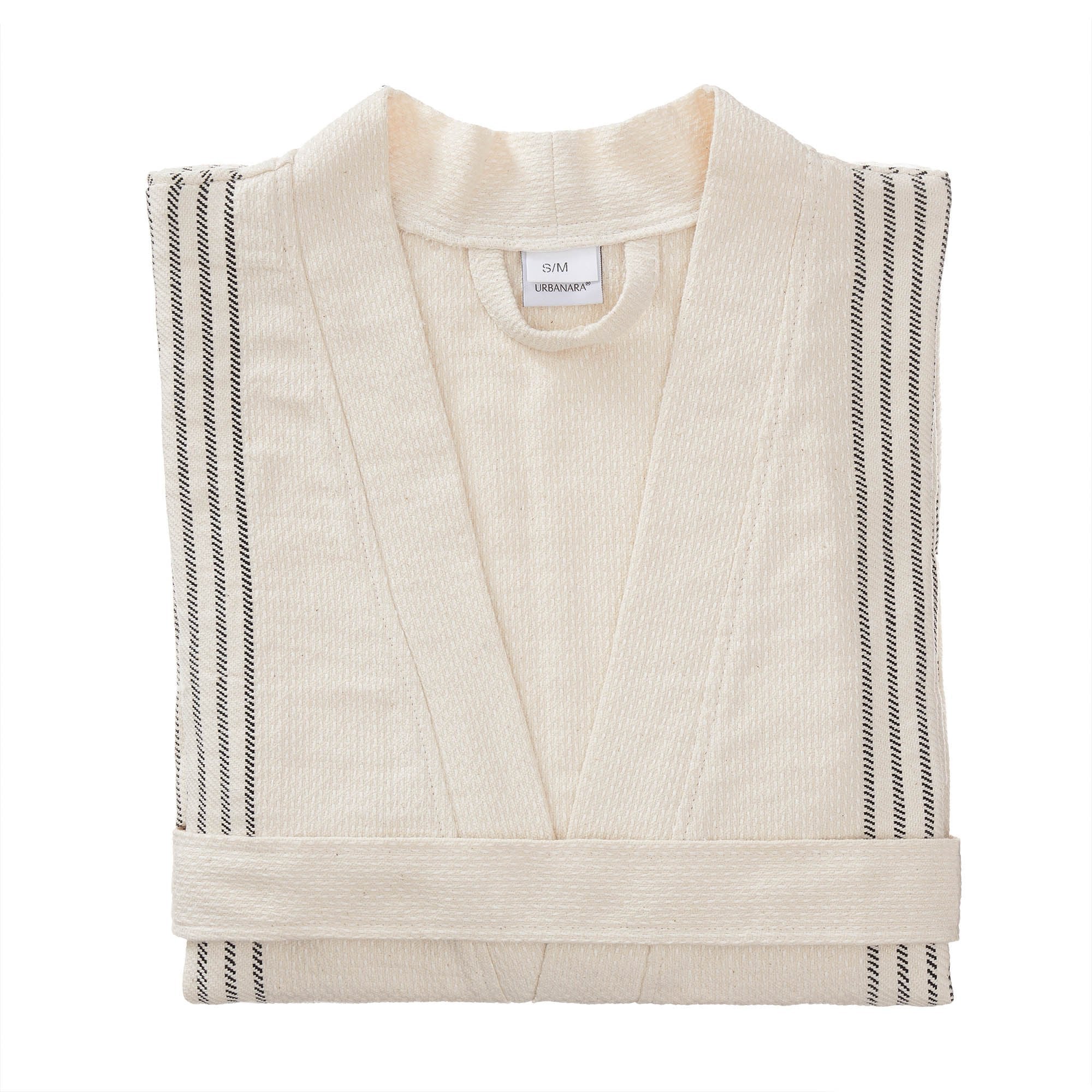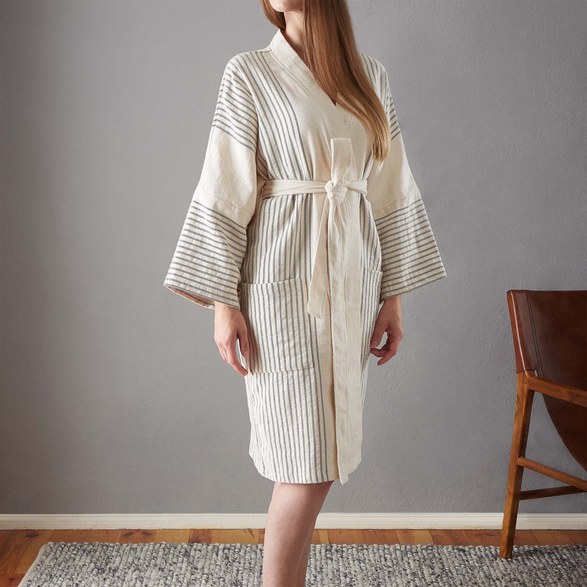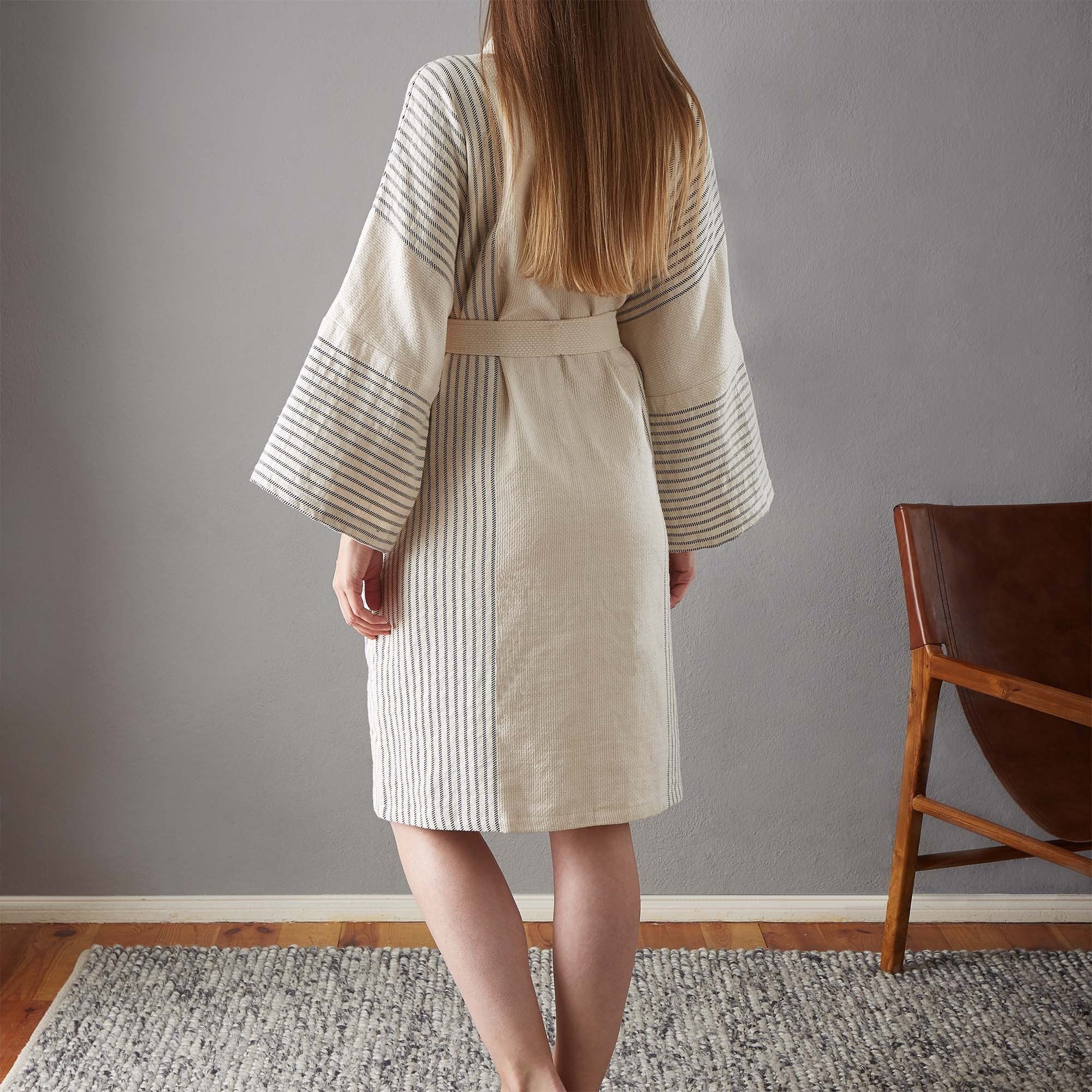 Unser Bademantel Kadan wird aus einem Mix aus hochwertiger Baumwolle und natürlichem Leinen von unseren Partnern in Litauen in eleganter Jacquardbindung verwoben. Im Kimonostil mit Bindegürtel auf Taillenhöhe verleiht Ihnen der großzügig geschnittene und komfortable Bademantel ein wahres Spa-Erlebnis. Da das Leinen-Baumwoll-Gemisch eher etwas dünner ist, eignet sich der Bademantel ideal für die wärmeren Monate oder für Saunabesuche, bei denen man sich gerne stilvoll verhüllen und keinen dickeren Frotteebademantel anziehen möchte.