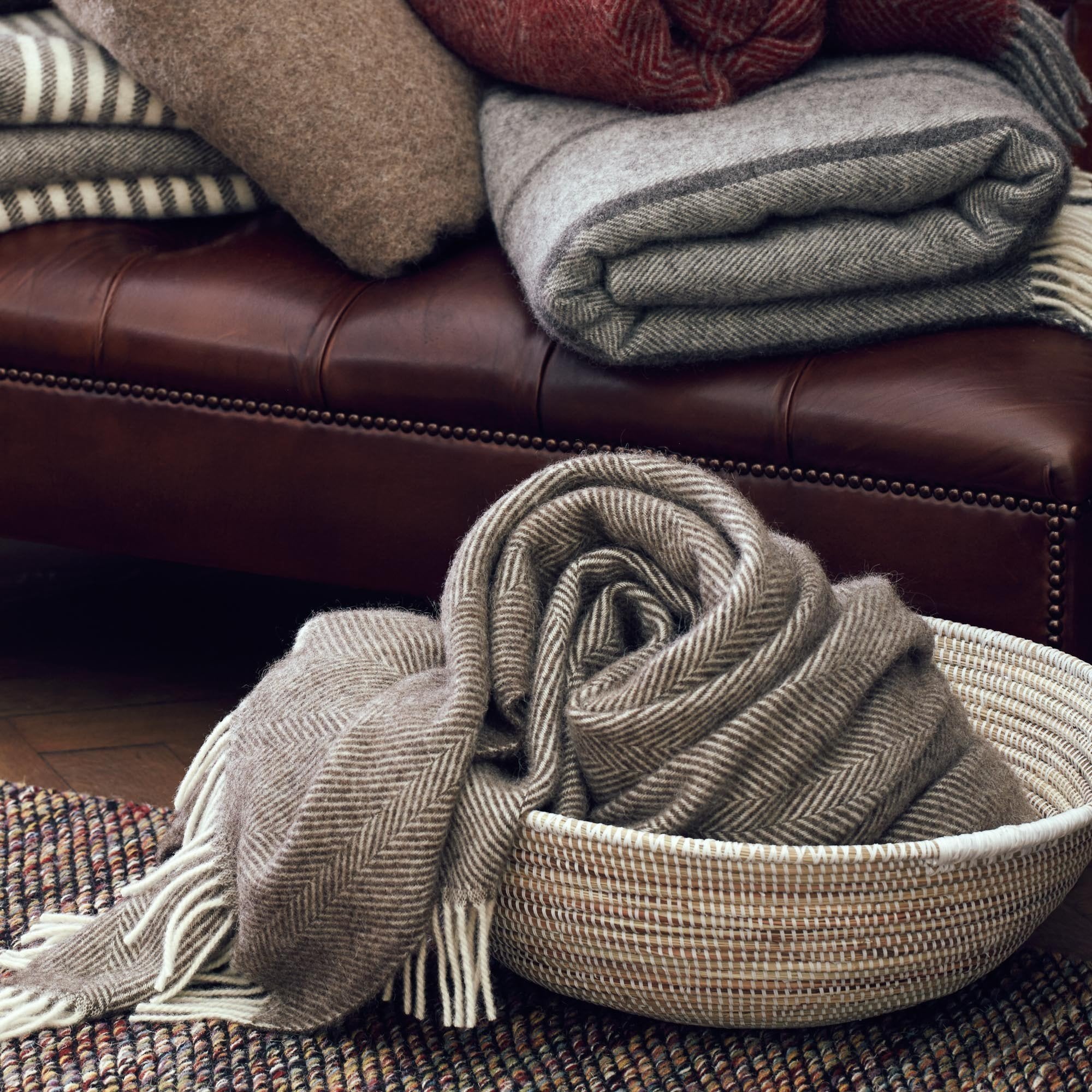 Für unsere Wolldecke Salantai verarbeiten unsere Partner in Litauen hochwertige Schurwolle zu einem eleganten Fischgratdesign. Das zeitlose Muster wird mit Fransen an den Enden abgerundet und verschönert jedes Zuhause. Wohliger Komfort bei herausragender Ästhetik.