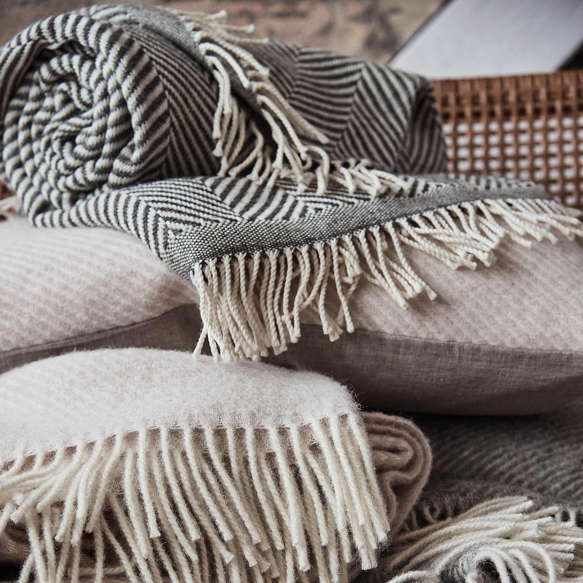 Mit viel Liebe zum Detail wird 100% natürliche und gekämmte Schurwolle aus Neuseeland von unseren dänischen Partnern in Twill zu dem filigranen Fischgratmuster verwoben, das unsere wunderschöne und wärmende Wolldecke Salla so einzigartig macht. Mit verdrehten Fransen versehen ist die stilvolle Decke ein modernes Accessoire für Ihr Zuhause.