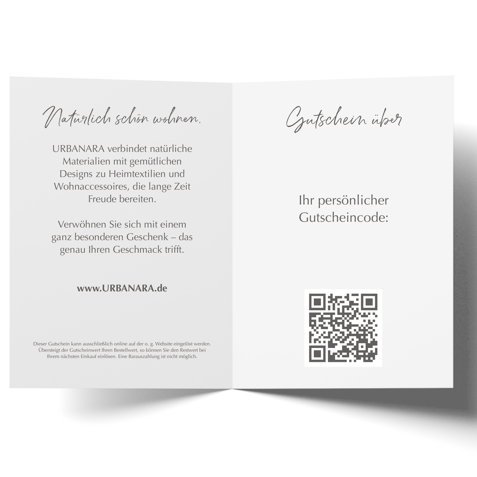 - Sie erhalten Ihren URBANARA Geschenkgutschein im digitalen Format, zugesendet an die von Ihnen angegebene E-Mail-Adresse. Dieser kann anschließend von Ihnen ausgedruckt und verschenkt werden.