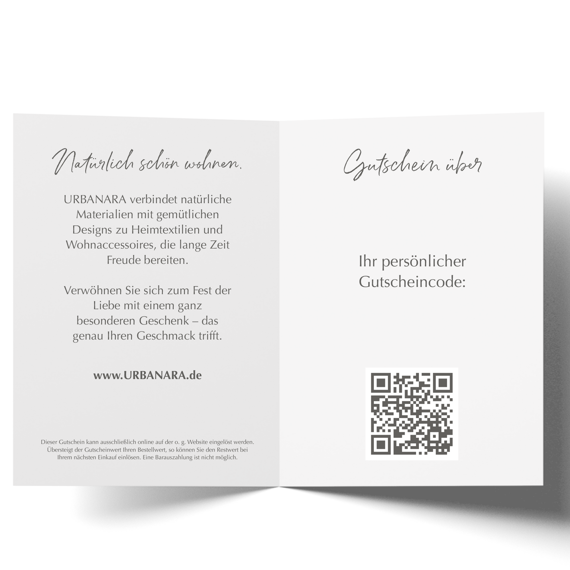 Bereiten Sie einem Lieblingsmenschen eine besonders gemütliche, ansprechende Freude und überraschen Sie diese Person mit einem Geschenkgutschein von URBANARA. Wählen Sie einen festen Betrag und ein Design, das zu Ihrem Anlass passt – wir kümmern uns um den Rest.