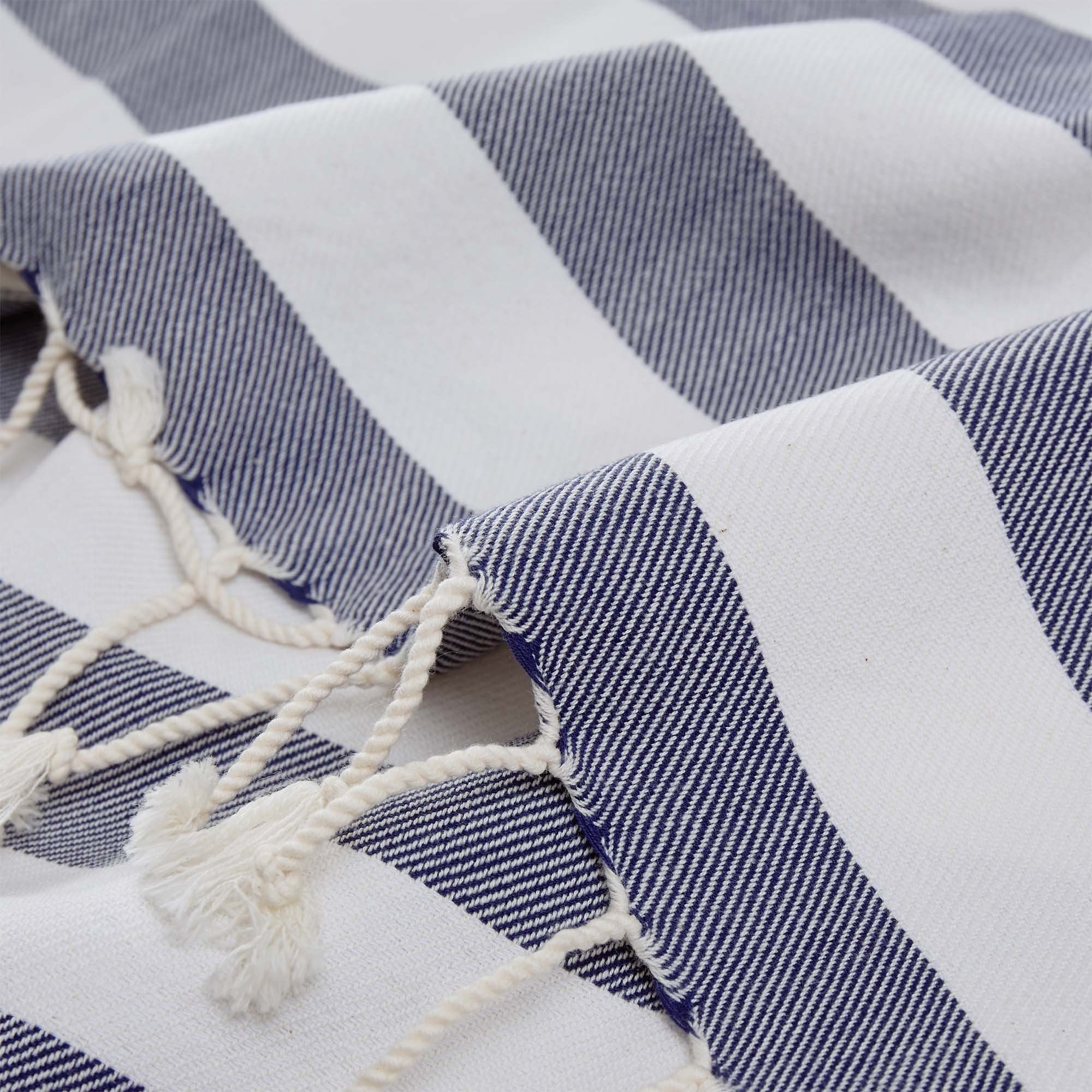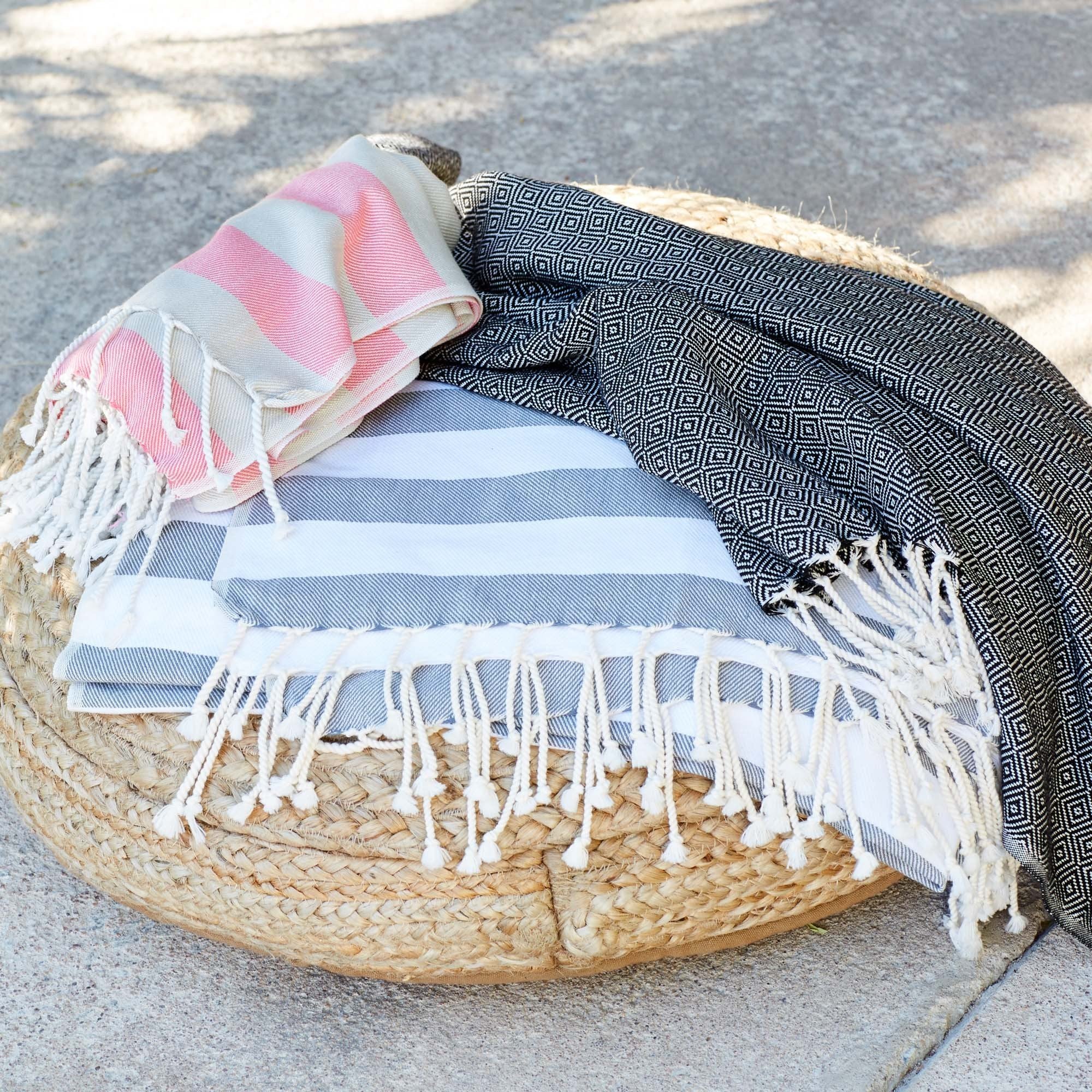 Für unser Hamamtuch Filiz verarbeiten unsere Partner in der Türkei 100% hochwertige Baumwolle in Twillbindung zu einem wunderschönen Tuch mit Blockstreifen, das sich geschmeidig anfühlt und schön fällt. Filiz ist besonders leicht, saugfähig, schnelltrocknend und nimmt wenig Platz in ihrer Strand- oder Badetasche in Anspruch. Abgerundet wird das Design mit Fischgrätmuster mit gedrehten Fransen an beiden Enden.