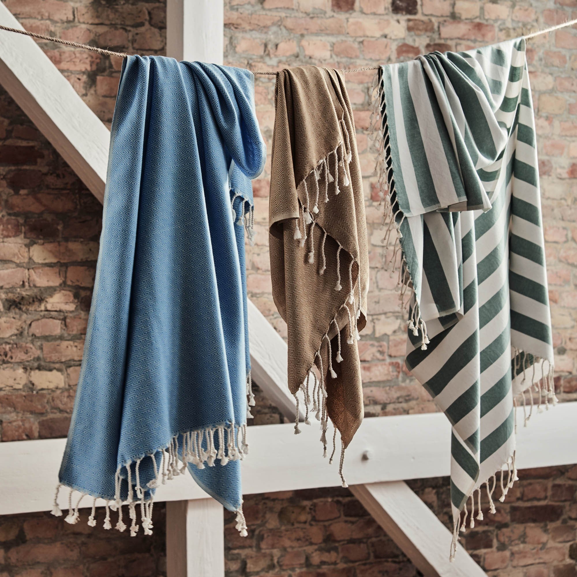 Für unser Hamamtuch Filiz verarbeiten unsere Partner in der Türkei 100% hochwertige Baumwolle in Twillbindung zu einem wunderschönen Tuch mit Blockstreifen, das sich geschmeidig anfühlt und schön fällt. Filiz ist besonders leicht, saugfähig, schnelltrocknend und nimmt wenig Platz in ihrer Strand- oder Badetasche in Anspruch. Abgerundet wird das Design mit Fischgrätmuster mit gedrehten Fransen an beiden Enden.