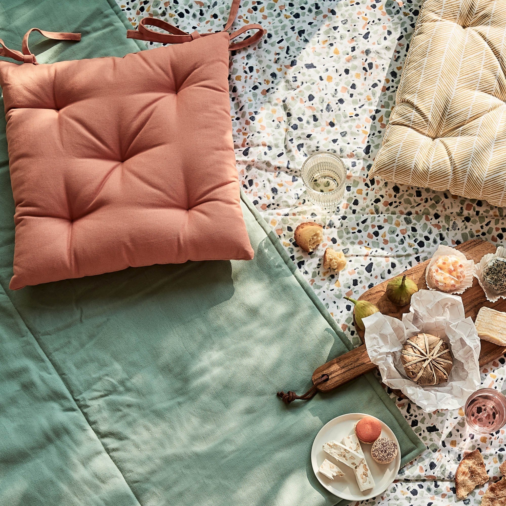 Ob Zuhause auf dem Balkon oder beim Picknick im Park: Unser Sitzkissen Isaka aus Baumwoll-Canvas ist besonders weich gepolstert und sorgt mit dekorativ platzierten Punkt-Stichen für ein entspanntes Ambiente. Durch fest angenähte Bänder lässt sich das Kissen an Stühlen befestigen. Die Färbung des Stoffs ist nicht lichtbeständig, wodurch intensive Sonneneinstrahlung die Farbgebung des Polsters verändern kann. Die Füllung kann nicht entnommen werden.