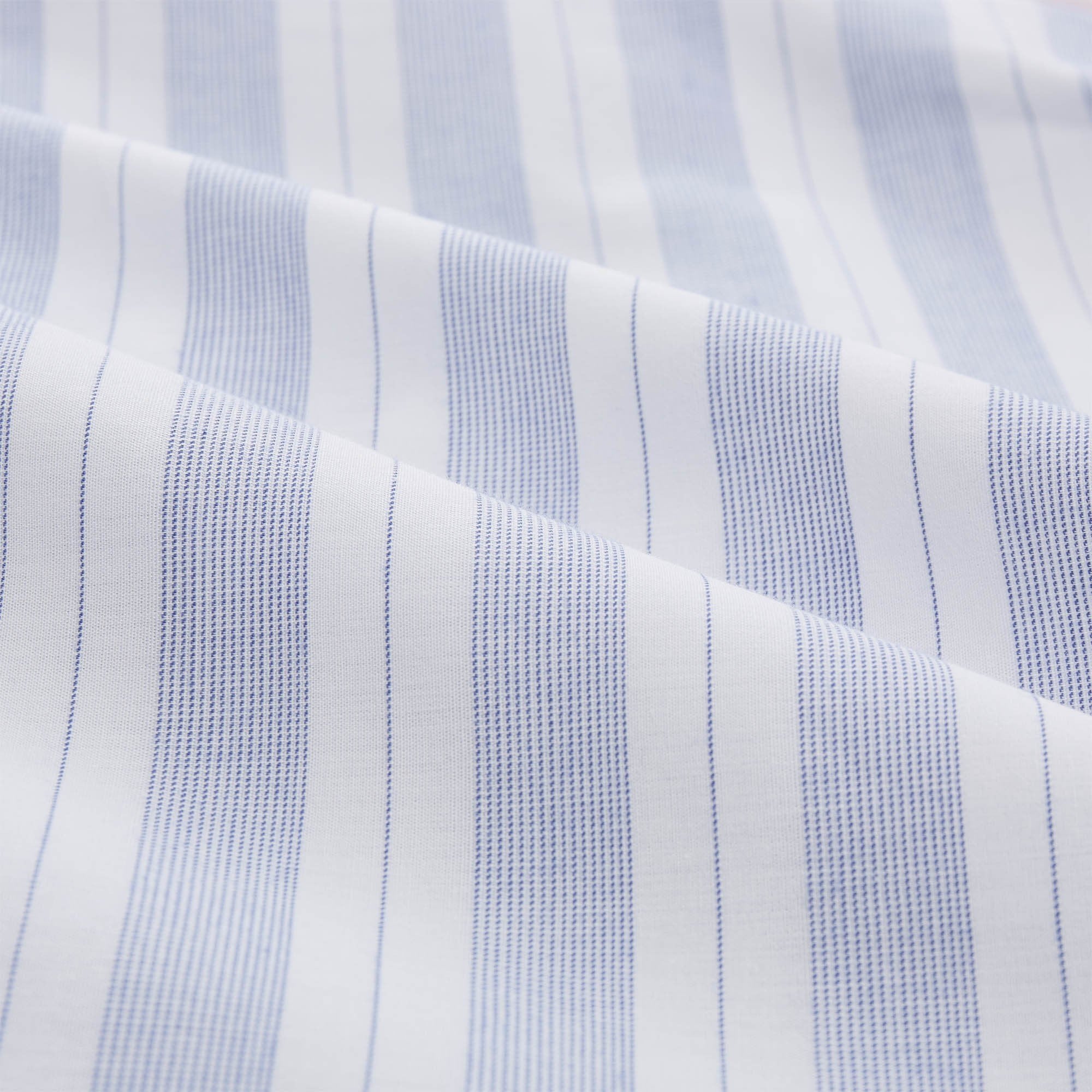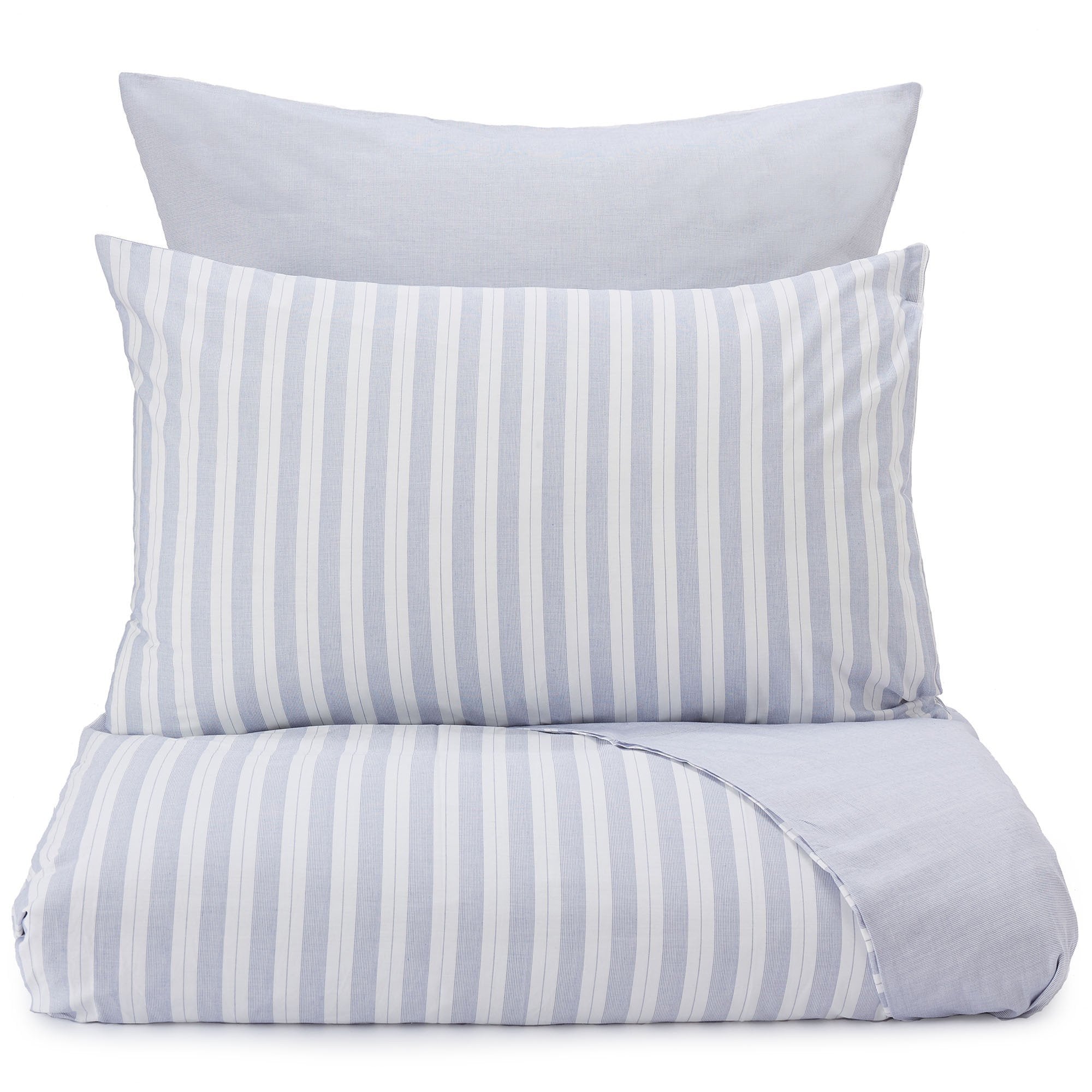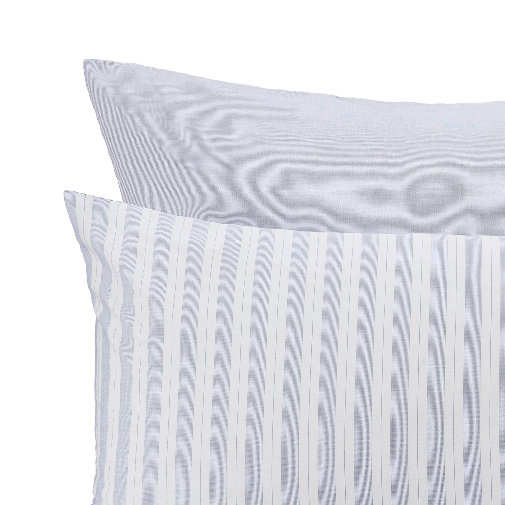 Ein Hoch auf Streifen. Für unsere Perkal-Bettwäsche Izeda verweben unsere Partner in Portugal beste Baumwolle in Dobby-Bindung mit leichter Textur. Breite unregelmäßige Streifen kreieren auf der Vorderseite ein maritimes Flair, während zarte Linien auf der Rückseite einen schönen Kontrast bilden. Ein Kissenbezug mit Einschlag und verdeckte Knöpfe an der Bettdecke schließen die Bettwäsche-Kollektion.
