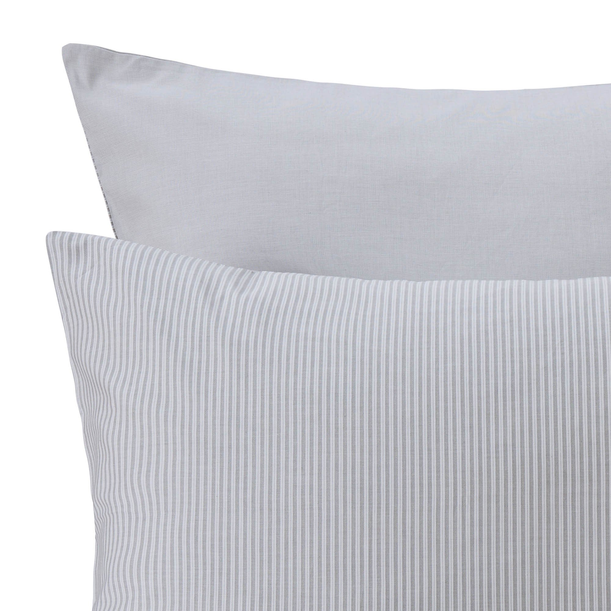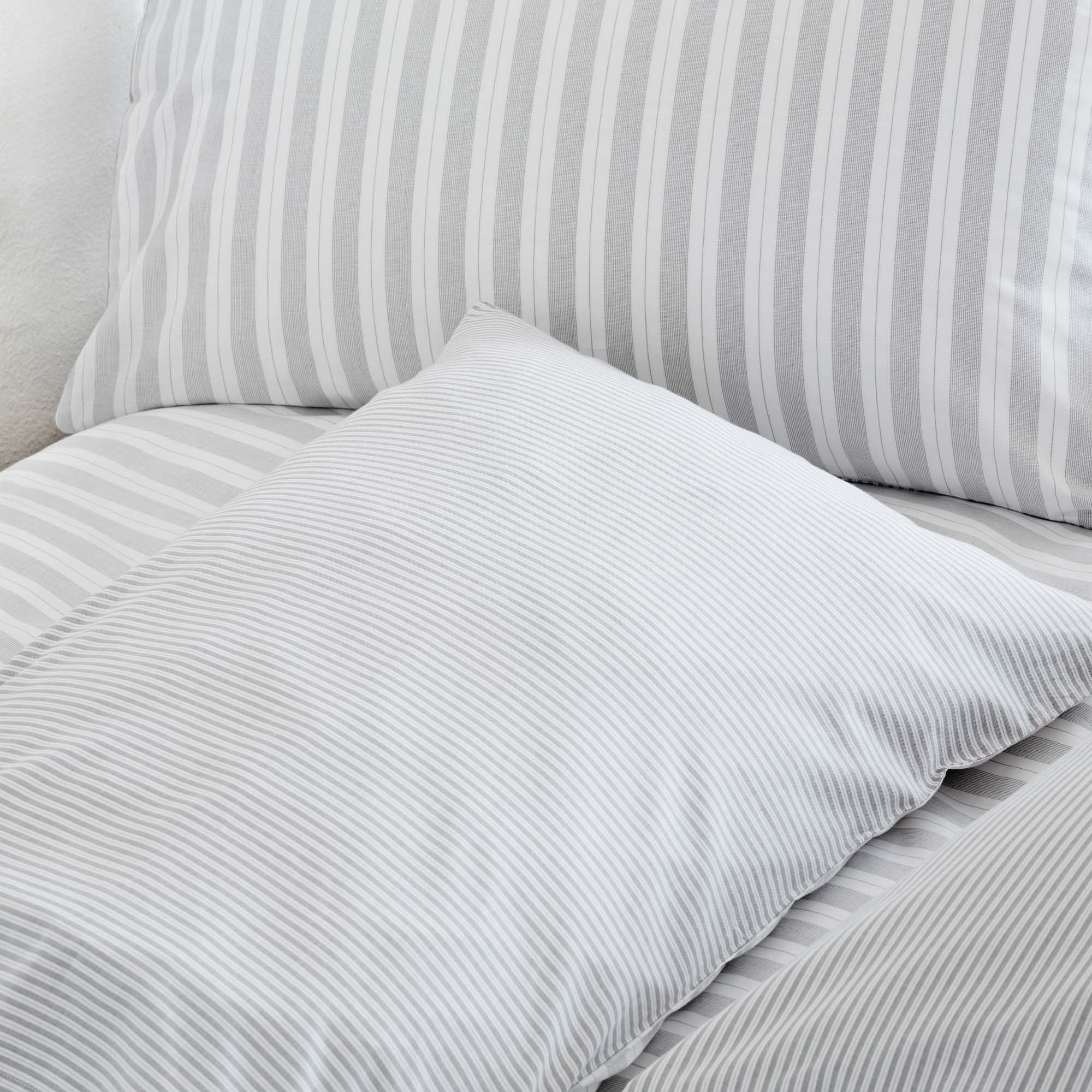 Ein Hoch auf Streifen. Für unsere Perkal-Bettwäsche Izeda verweben unsere Partner in Portugal beste Baumwolle in Dobby-Bindung mit leichter Textur. Breite unregelmäßige Streifen kreieren auf der Vorderseite ein maritimes Flair, während zarte Linien auf der Rückseite einen schönen Kontrast bilden. Ein Kissenbezug mit Einschlag und verdeckte Knöpfe an der Bettdecke schließen die Bettwäsche-Kollektion.