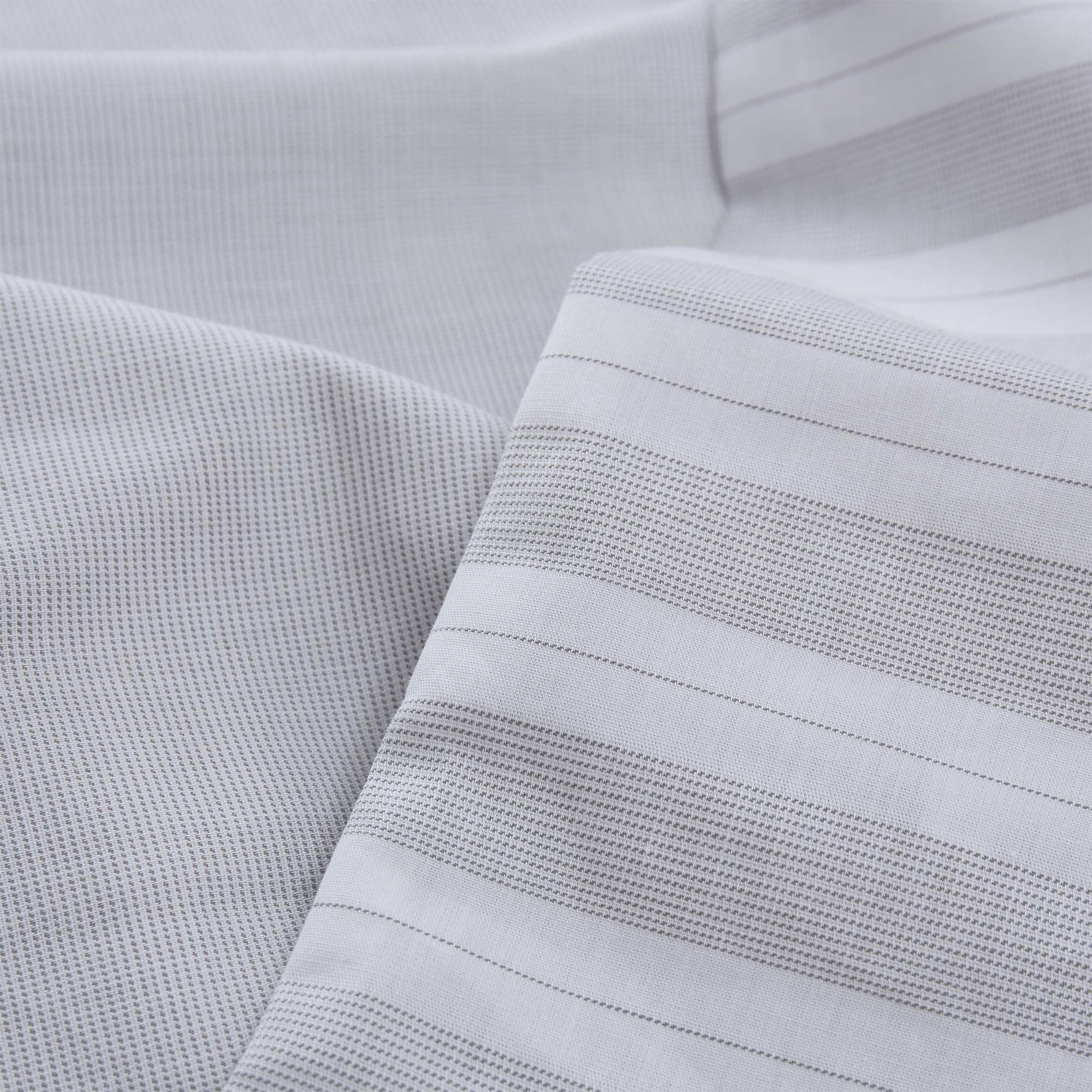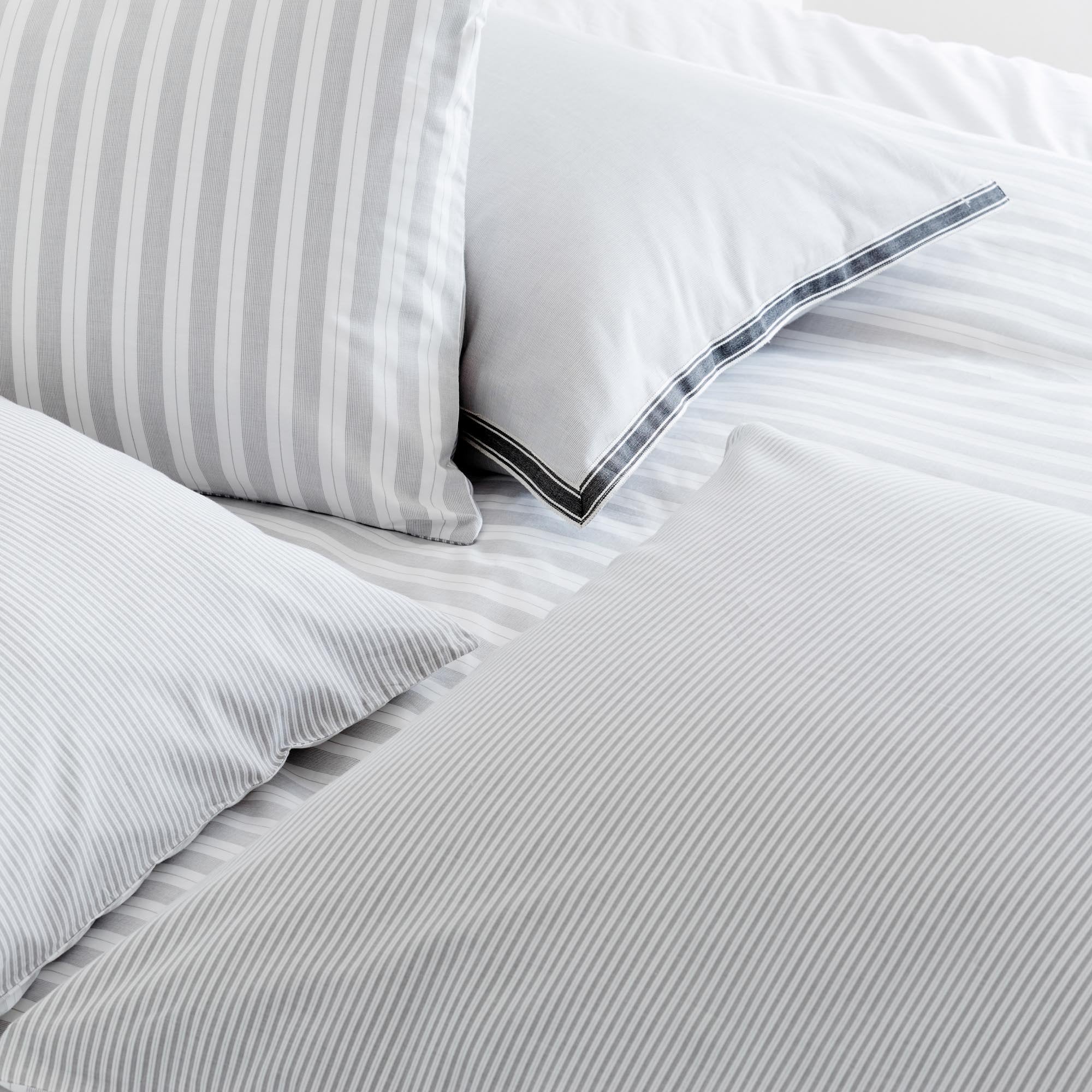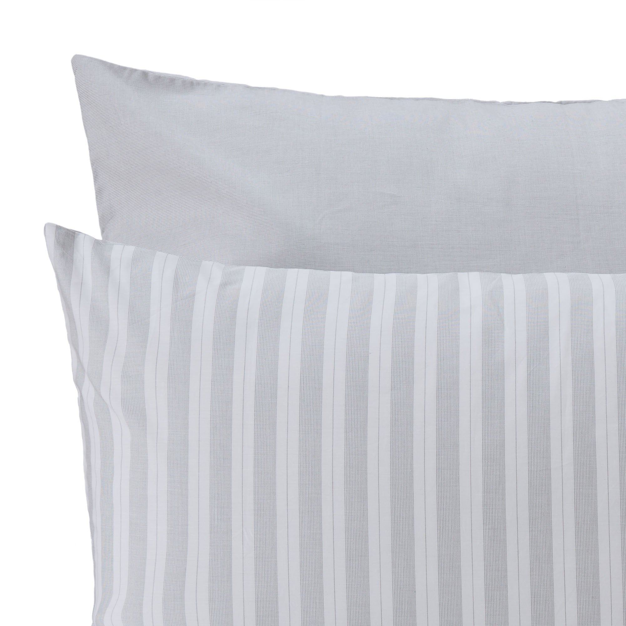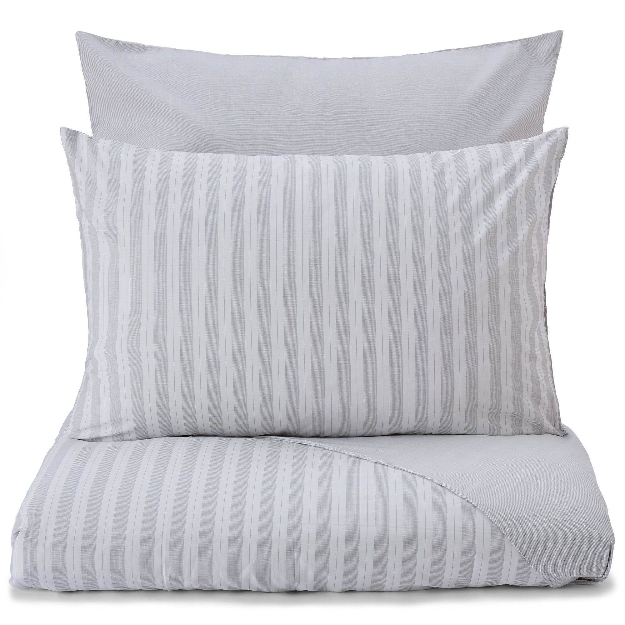 Ein Hoch auf Streifen. Für unsere Perkal-Bettwäsche Izeda verweben unsere Partner in Portugal beste Baumwolle in Dobby-Bindung mit leichter Textur. Breite unregelmäßige Streifen kreieren auf der Vorderseite ein maritimes Flair, während zarte Linien auf der Rückseite einen schönen Kontrast bilden. Ein Kissenbezug mit Einschlag und verdeckte Knöpfe an der Bettdecke schließen die Bettwäsche-Kollektion.