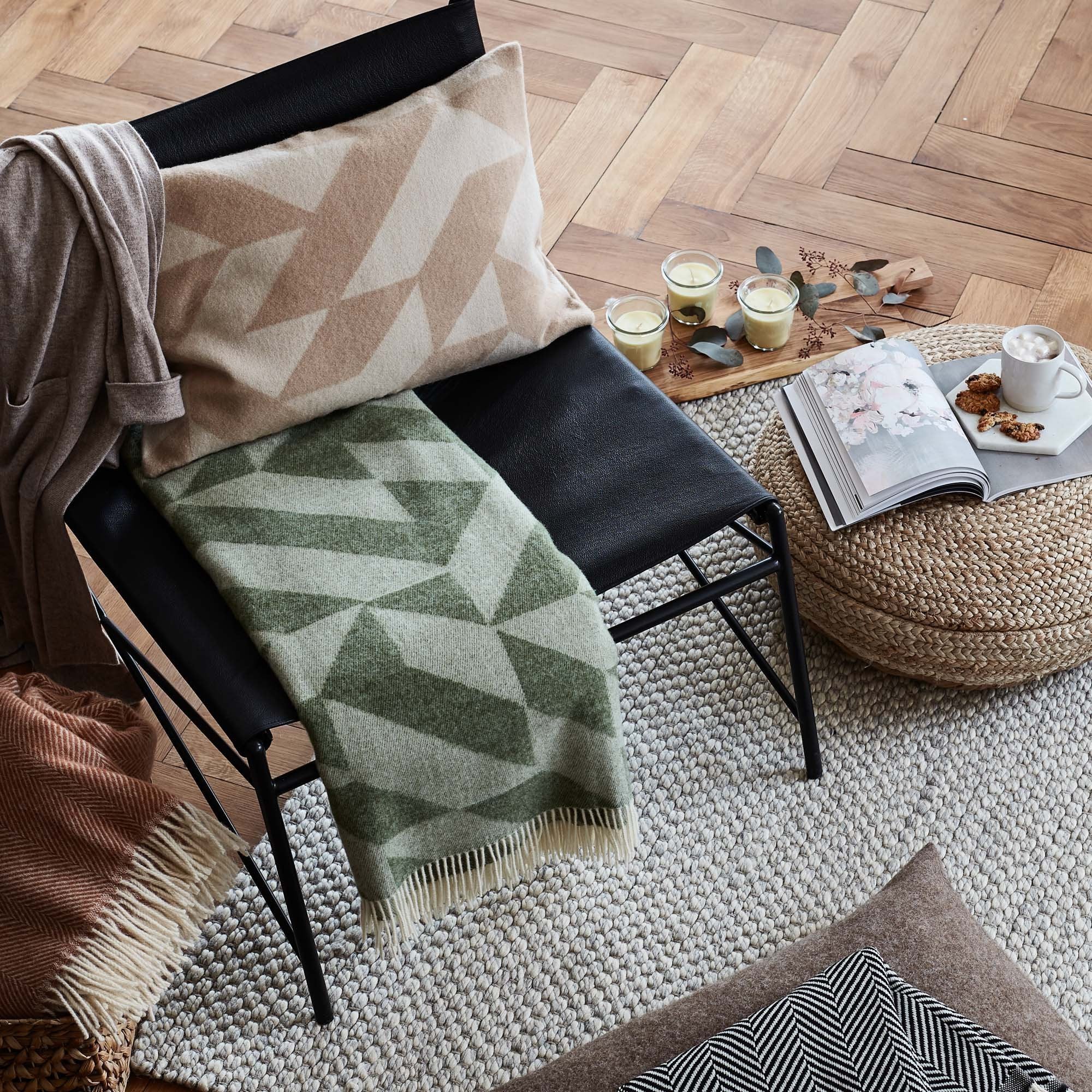 Für unser Kissen Farum wird feinste Merinowolle in eleganter Jaquardbindung zu einem geografischen Muster verwoben. Jede Kissenhülle ist ein Unikat, da sich das unregelmäßige geografische Muster bei jedem Kissen anders zusammensetzt und nicht wiederholt wird. Mittels eines Webstuhls können einzelne Fäden bewegt und damit eine besonders weiche Griffigkeit erreicht werden.