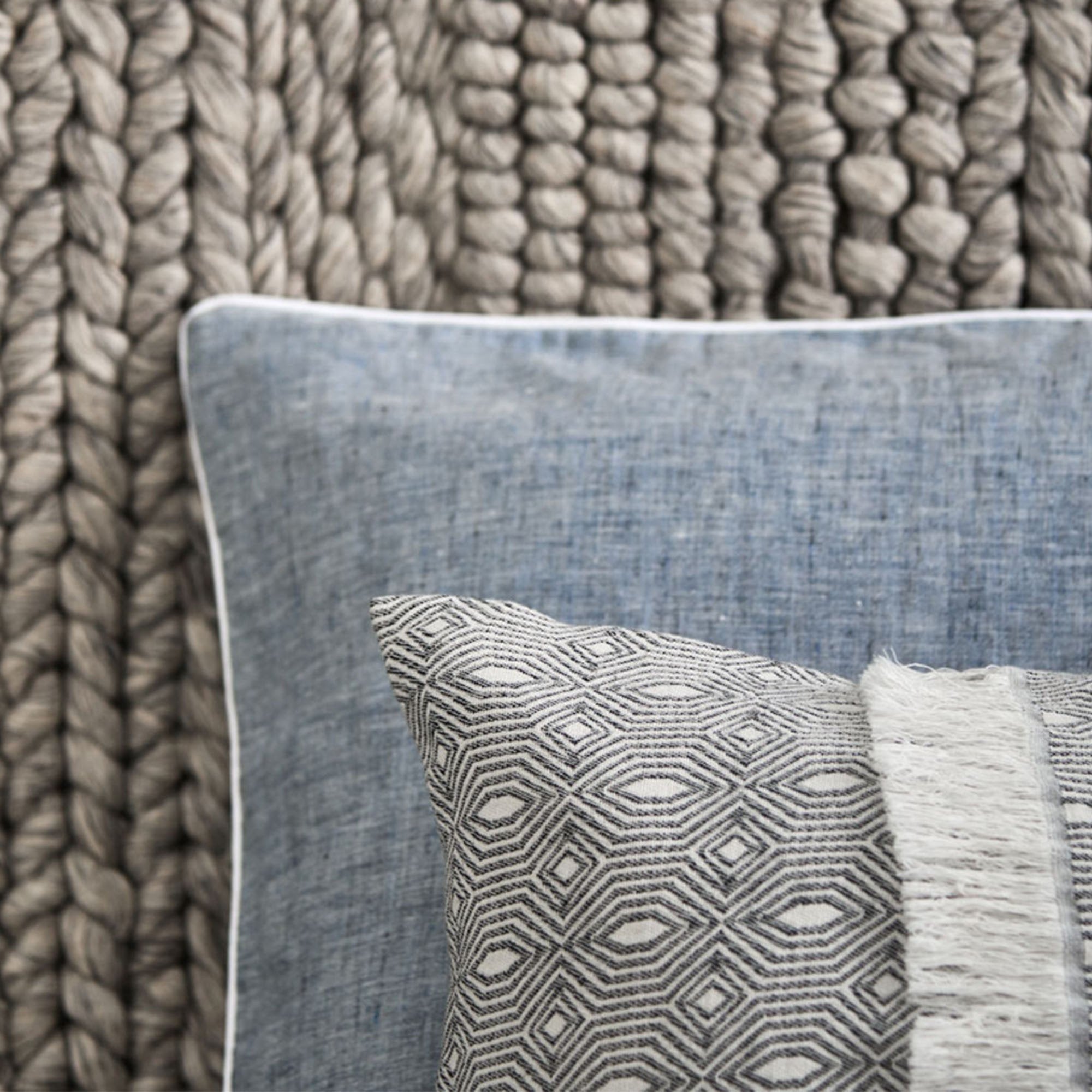 Für unsere Kissenhülle Sameiro werden Garne unterschiedlicher Farbnuancen und Stärken zu hochwertigem Chambray-Leinen verwoben. Das vorgewaschene Leinen bietet eine einzigartige Oberflächenstruktur und wird durch eine farblich abgesetzte Paspelierung dezent eingerahmt. Eine stilvolle Bereicherung für Wohn- und Schlafzimmer. Verschlossen wird das Kissen mit einem verdeckten Reißverschluss.