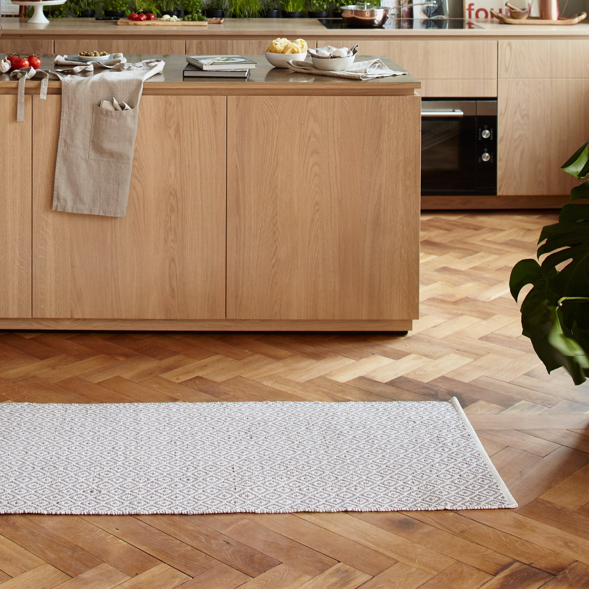 Unsere Partner in Indien verarbeiten reine Baumwolle in Twillbindung. Für unseren Läufer Tenali wird zudem ein ansprechendes Diamantmuster eingearbeitet, das ein orientalisches Flair nach Hause bringt und zeitlos schön ist. Kombiniert mit einer rutschfesten Unterlage bleibt der Läufer an Ort und Stelle.
