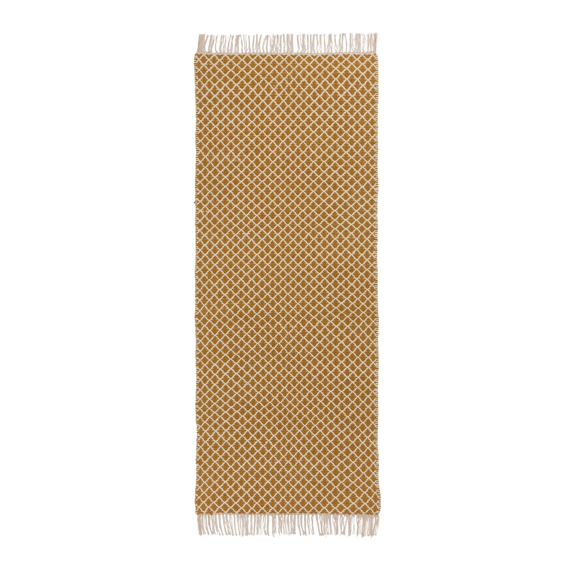 Für unsere Kollektion Loni wird ein Mix aus Wolle und Baumwolle von Hand in Leinwandbindung verwoben. Mit einem gespiegelten Diamantmuster auf Ober- und Unterseite schmückt Loni Ihre Böden nach Belieben in hellerer oder dunklerer Variante. Zarte Fransen an den Enden runden den zeitlosen Stil des Läufers ab. In Kombination mit einer rutschfesten Unterlage bleibt der Teppich an Ort und Stelle.