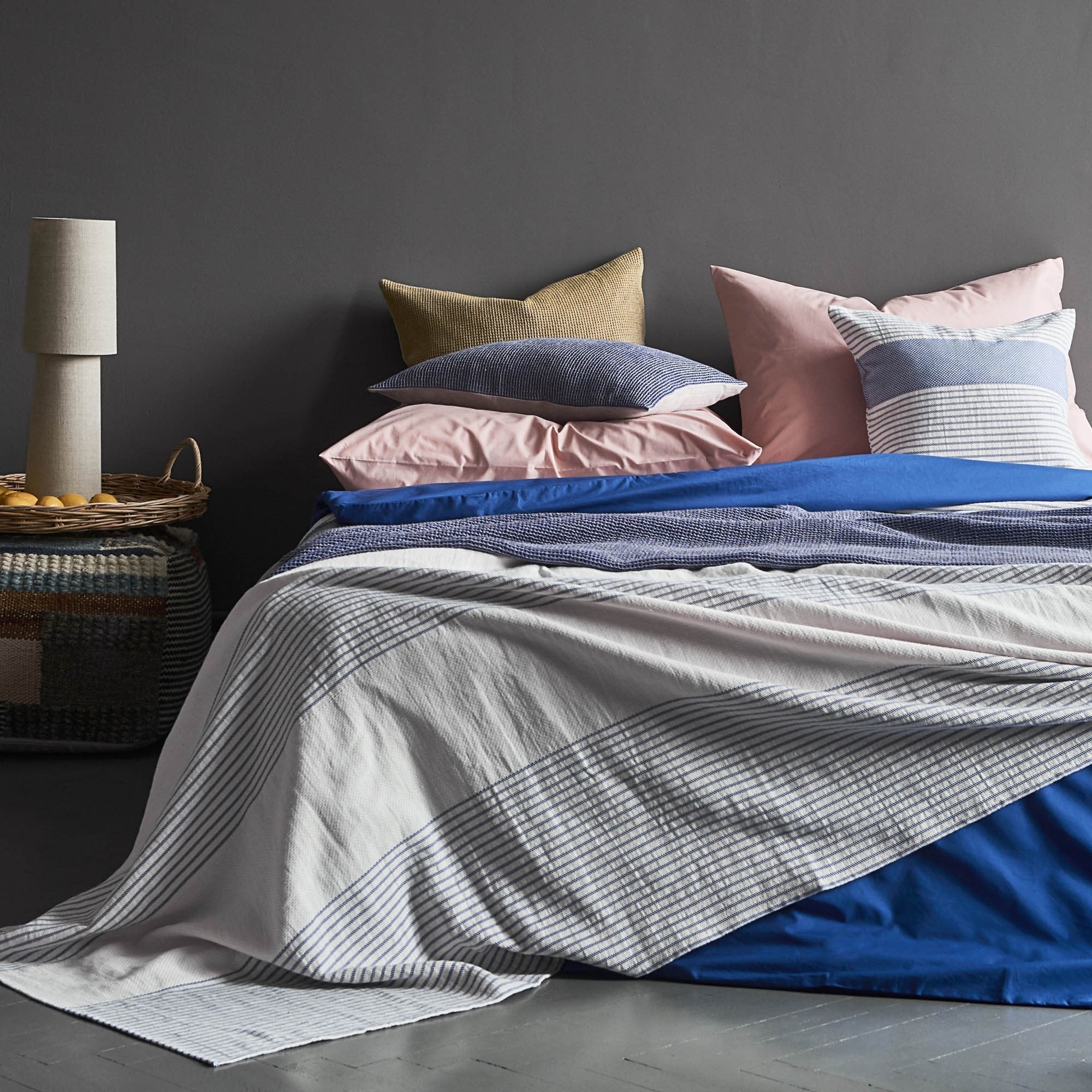 Unsere Tagesdecke Kadan wird aus einem Mix aus hochwertiger Baumwolle und natürlichem Leinen von unseren Partnern in Litauen in eleganter Jacquardbindung verwoben. Angelehnt an einen modernen Ethno-Look bringt die zweifarbige Tagesdecke spannende Momente auf Bett und Sofa, ohne sich aufzudrängen.