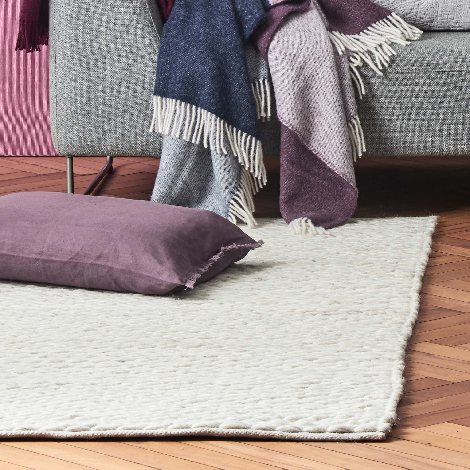 Unser Teppich Romo begeistert mit einem Mix aus natürlichem Wollfilz und Baumwolle, der von unseren Partnern in Indien sorgfältig in Leinwandbindung verwoben wird. Die Webung der zweifarbigen Wolle ergibt ein minimalistisch modernes Streifenmuster. Durch den Wollfilz erhält der Teppich eine erhabene Struktur und besonderen Charme. Kombiniert mit einer rutschfesten Unterlage bleibt der Teppich an Ort und Stelle.