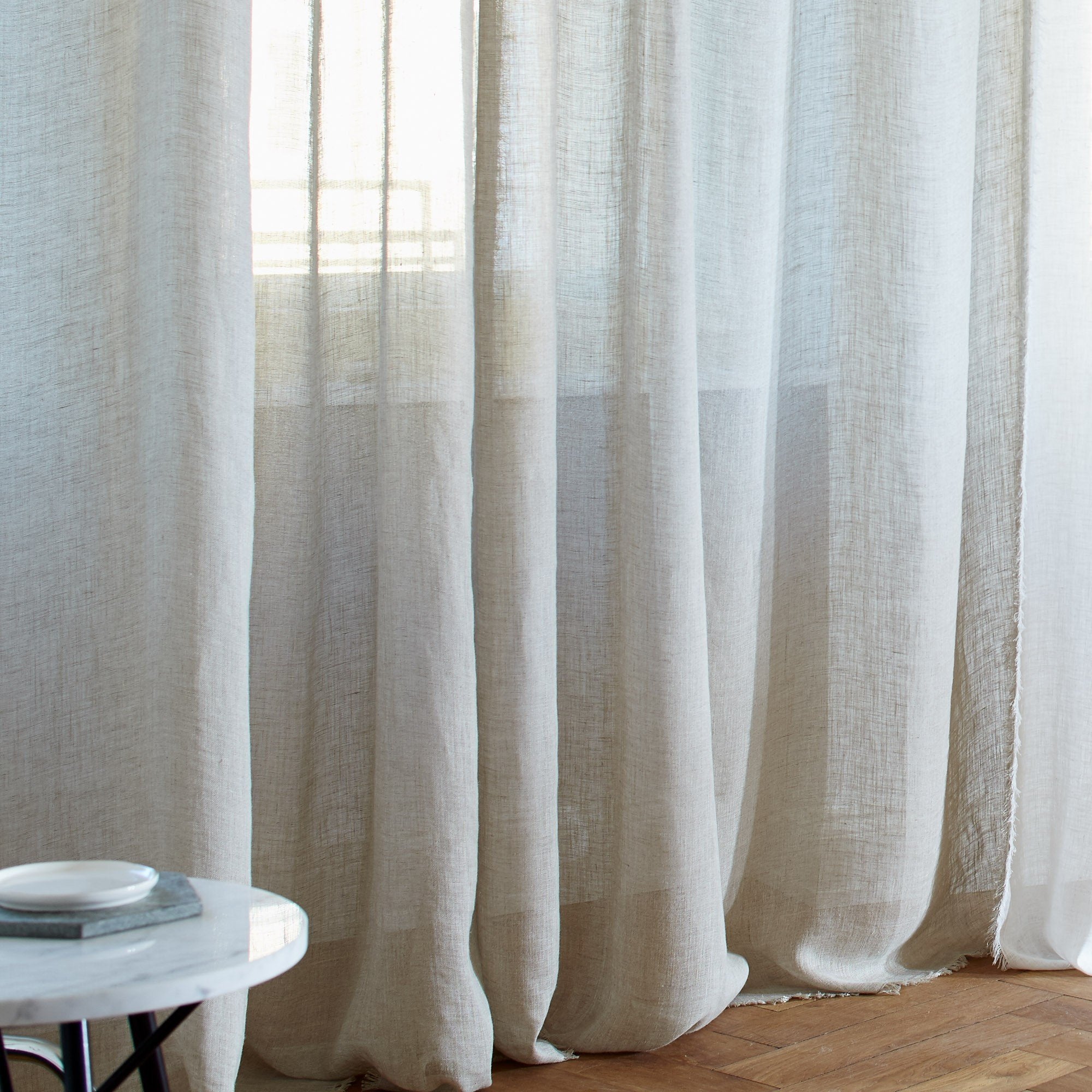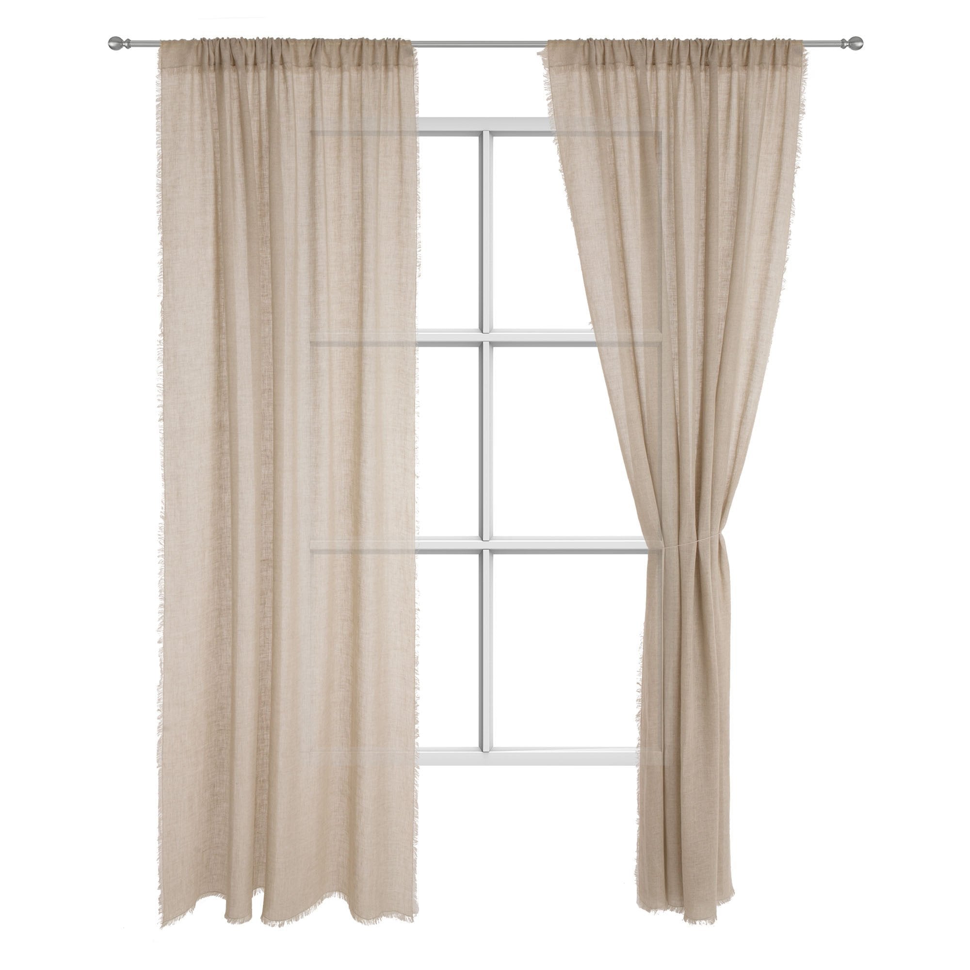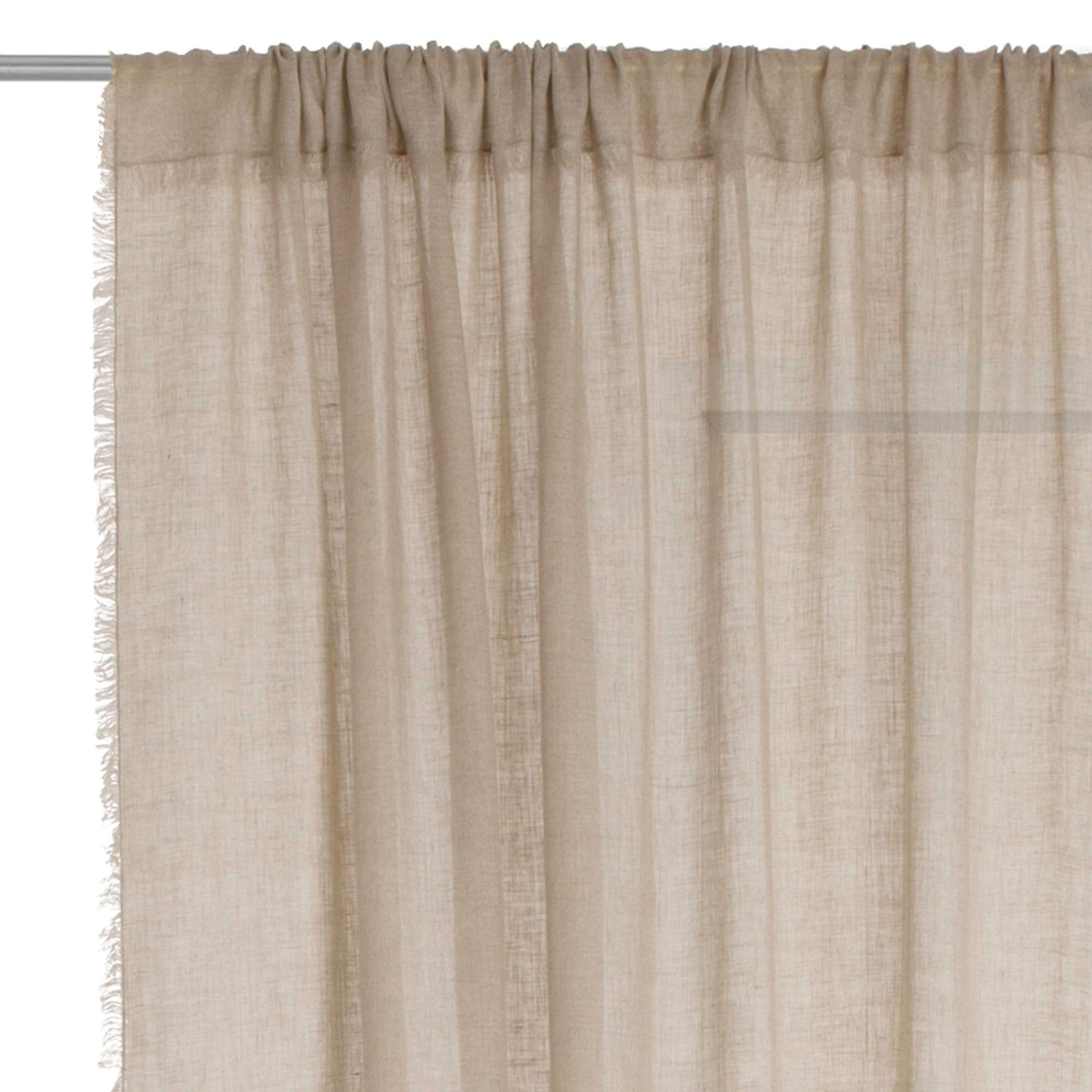 Für unseren stilvollen Vorhang Kiruna wird 100% Leinen in hochwertiger Leinwandbindung verarbeitet. Der semi-transparente Stoff lässt das Licht leicht in Ihr Zuhause hineinscheinen und schenkt Ihnen ein angenehmes Wohlfühlambiente. Das schlichte Design wird mit dekorativen Fransen am Rand verfeinert und ein Tunnelzug dient zur Aufhängung.